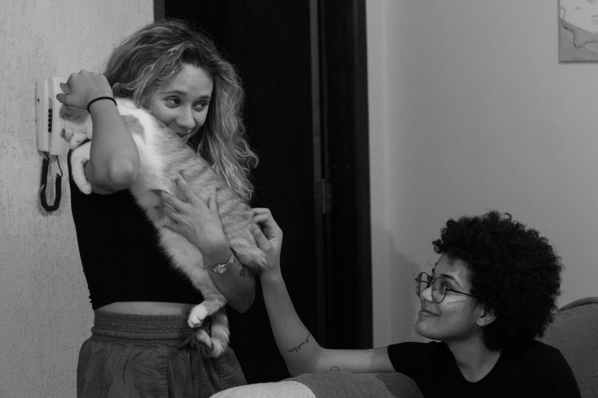 Tive a alegria de conhecer essas duas amigas no começo do ano, e agora a oportunidade de registrar o carinho e o amor que compartilham. Um dia simples e feliz, no apartamento onde vivem juntas com o gatinho Sonic, se transformou em memórias guardadas em imagem.