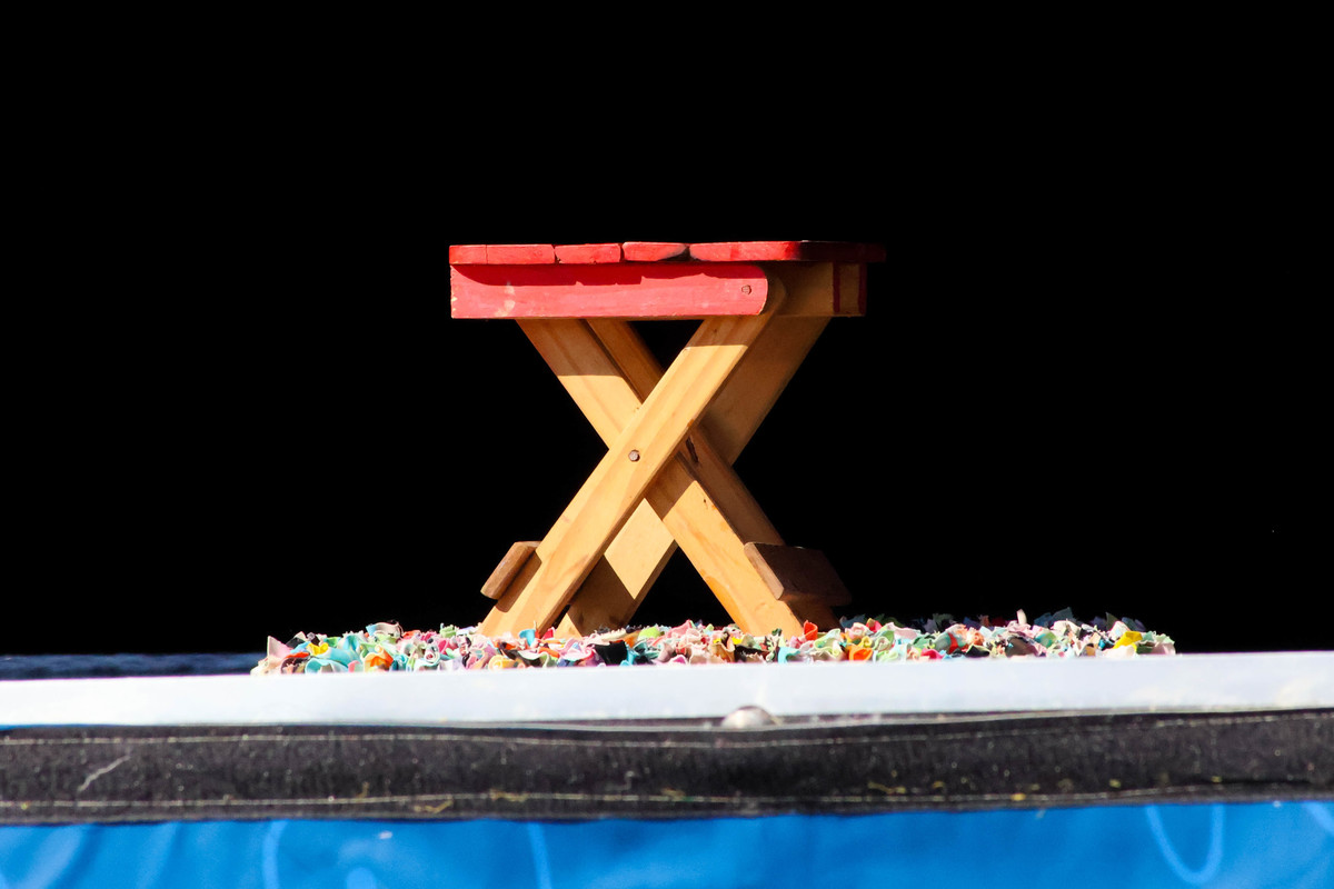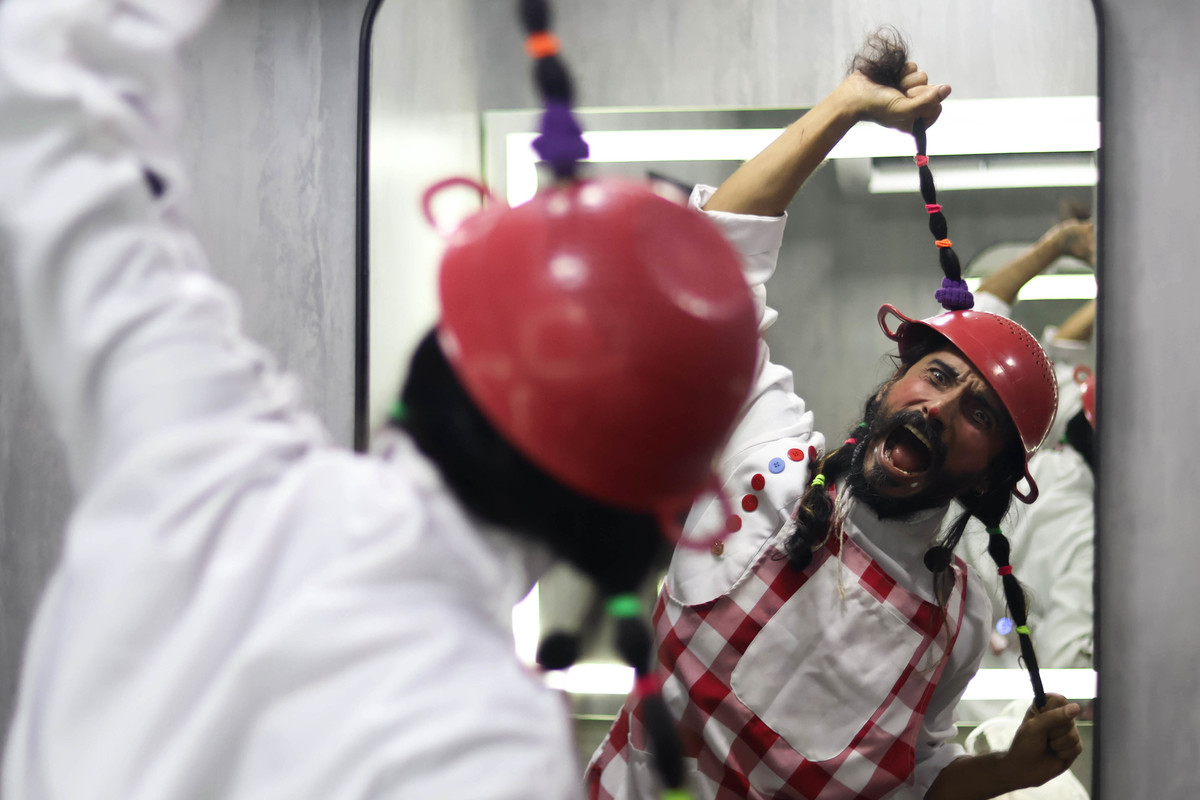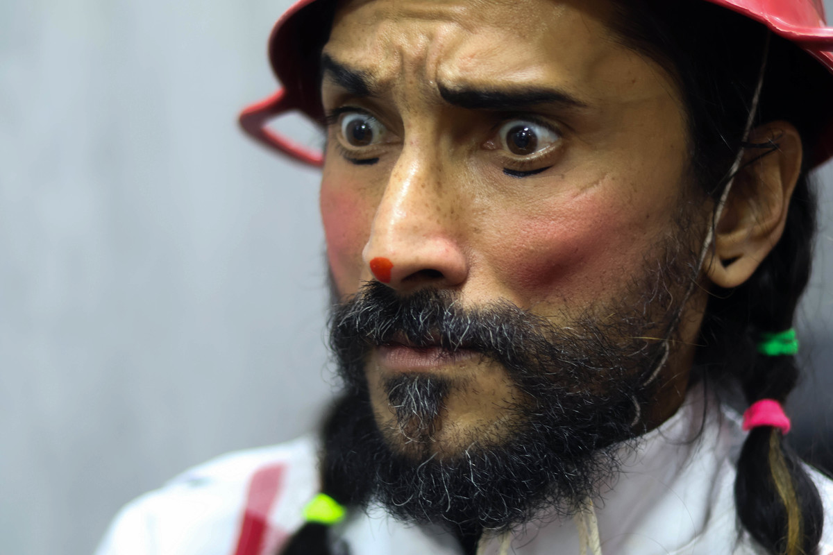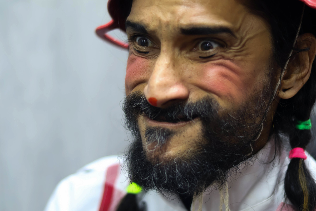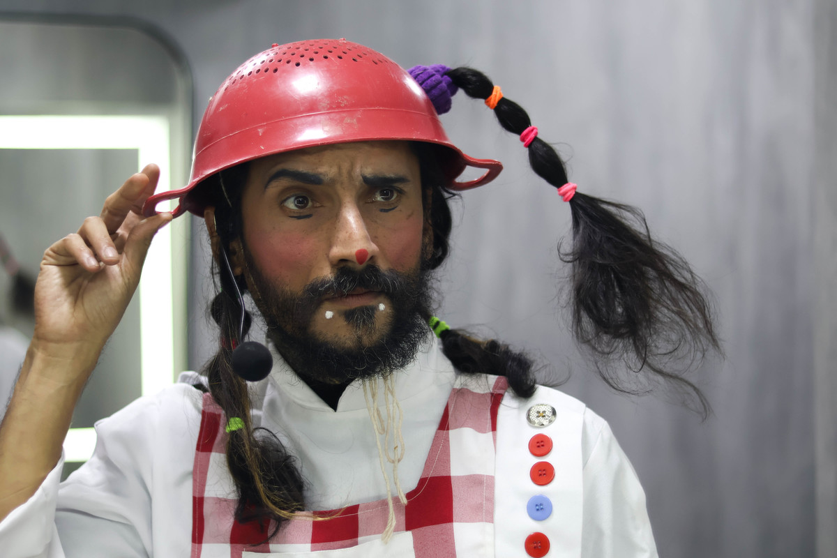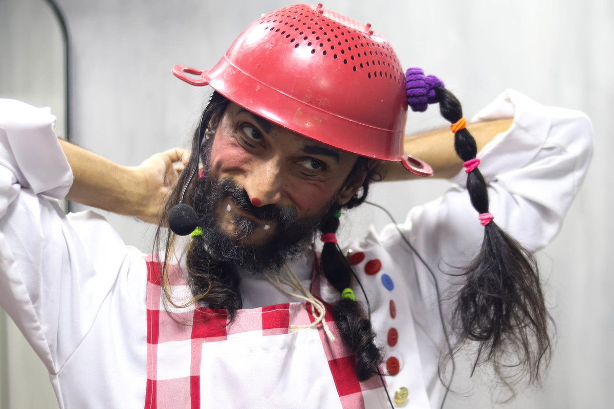 Nos bastidores, entre figurinos coloridos e pequenos objetos cênicos, o palhaço se preparava. O rosto, cuidadosamente pintado de branco e vermelho, ia ganhando vida diante do espelho. Cada gesto lento, cada respiração, já anunciava a ternura e o riso que logo chegariam ao palco.